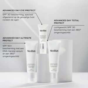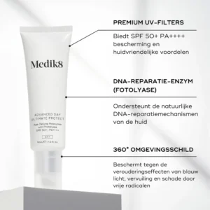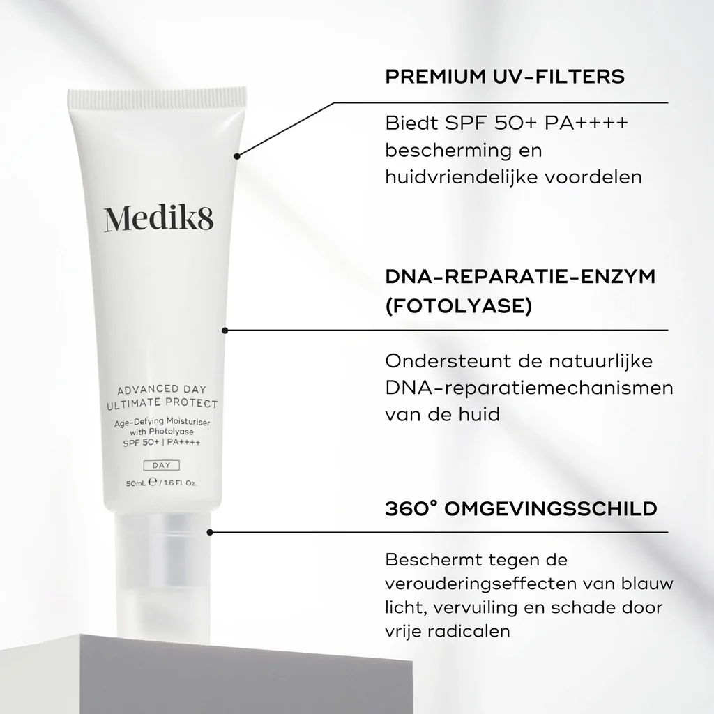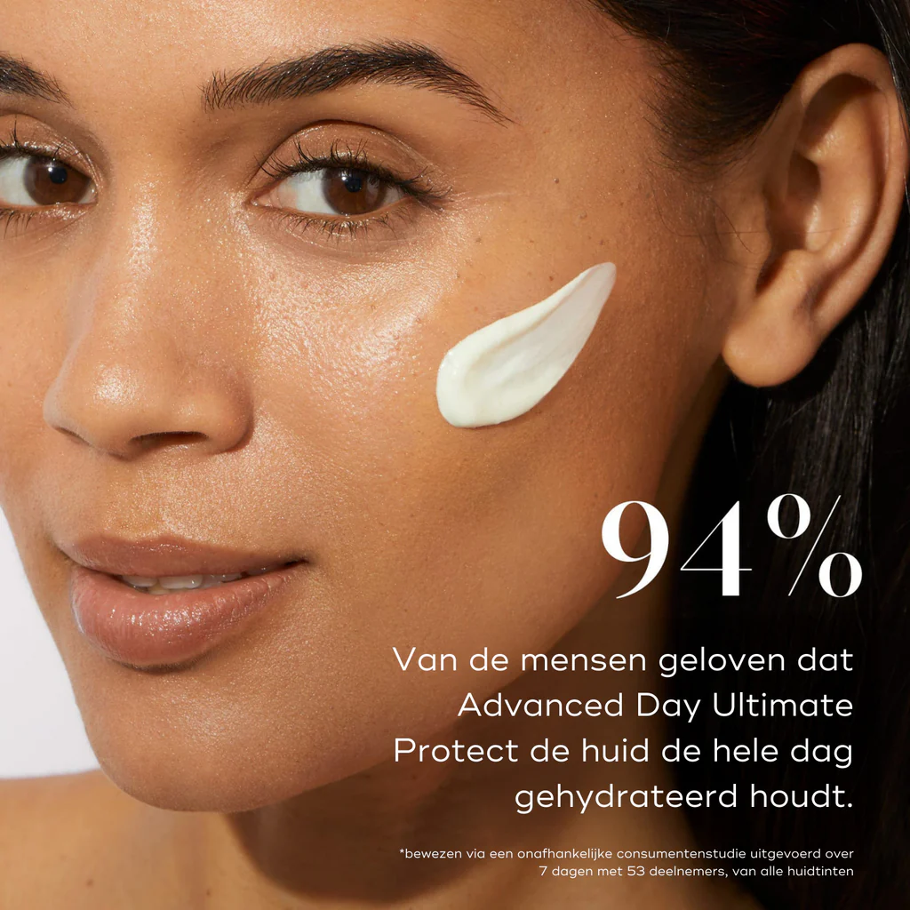 De Advanced Day Ultimate Protect is dé ultieme hydraterende dagcrème met zonbescherming SPF 50+ en biedt daarmee de hoogst mogelijke UV bescherming om door de zon veroorzaakte vroegtijdige tekenen van huidveroudering te voorkomen. De crème biedt de huid bescherming tegen het milieu, blauw licht, infrarood licht, glycatie én vervuiling. Doordrenkt met voedende squalane zorgt de crème voor een optimale dagelijkse hydratatie van de huid.