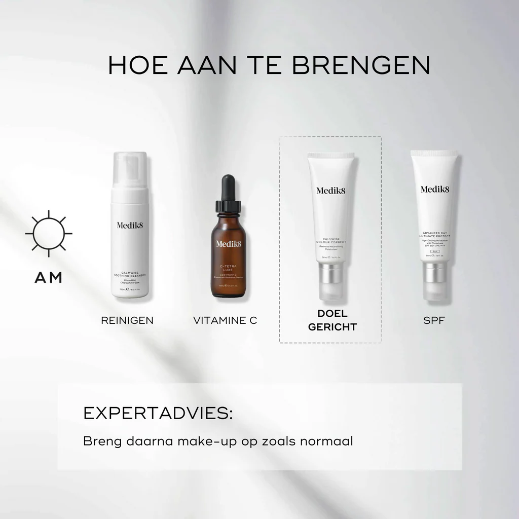 1. Na reiniging en serum ’s morgens en ’s avonds, een kleine hoeveelheid Calmwise Colour Correct aanbrengen op gezicht, hals en decolleté, de gevoelige huid rond de ogen vermijden.