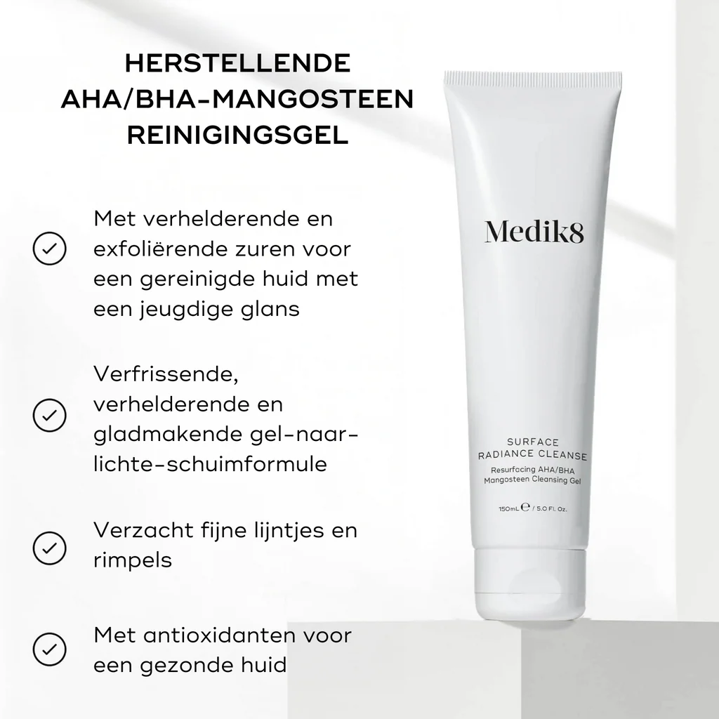 Ervaar een grondige reiniging en verfrissende glow met Medik8 Surface Radiance Cleanse. Deze luxe gelreiniger combineert exfoliërende zuren en krachtige antioxidanten voor een stralende, egale teint.
